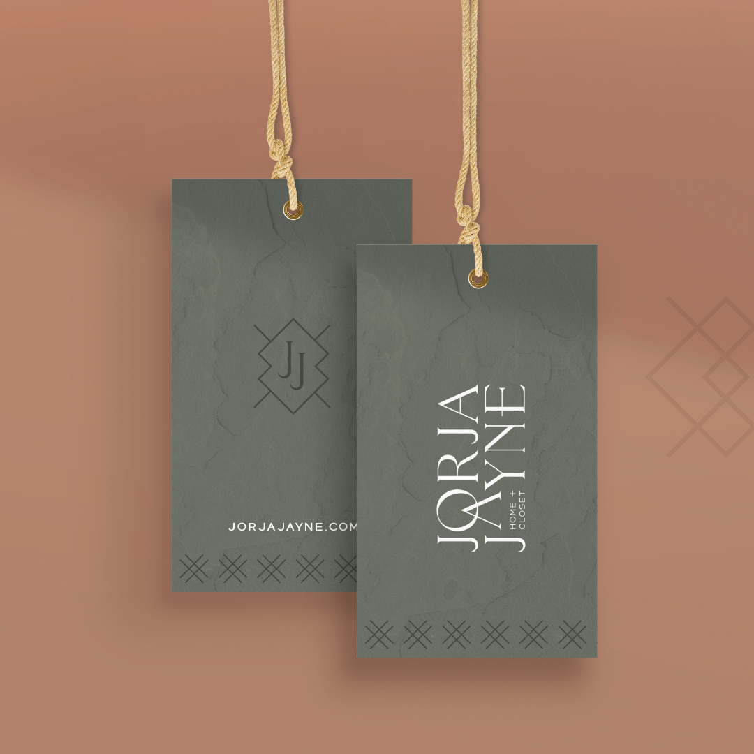 Branded hang tags and tissue paper designed to extend Jorja Jayne Boutique’s visual identity across packaging and customer touchpoints.