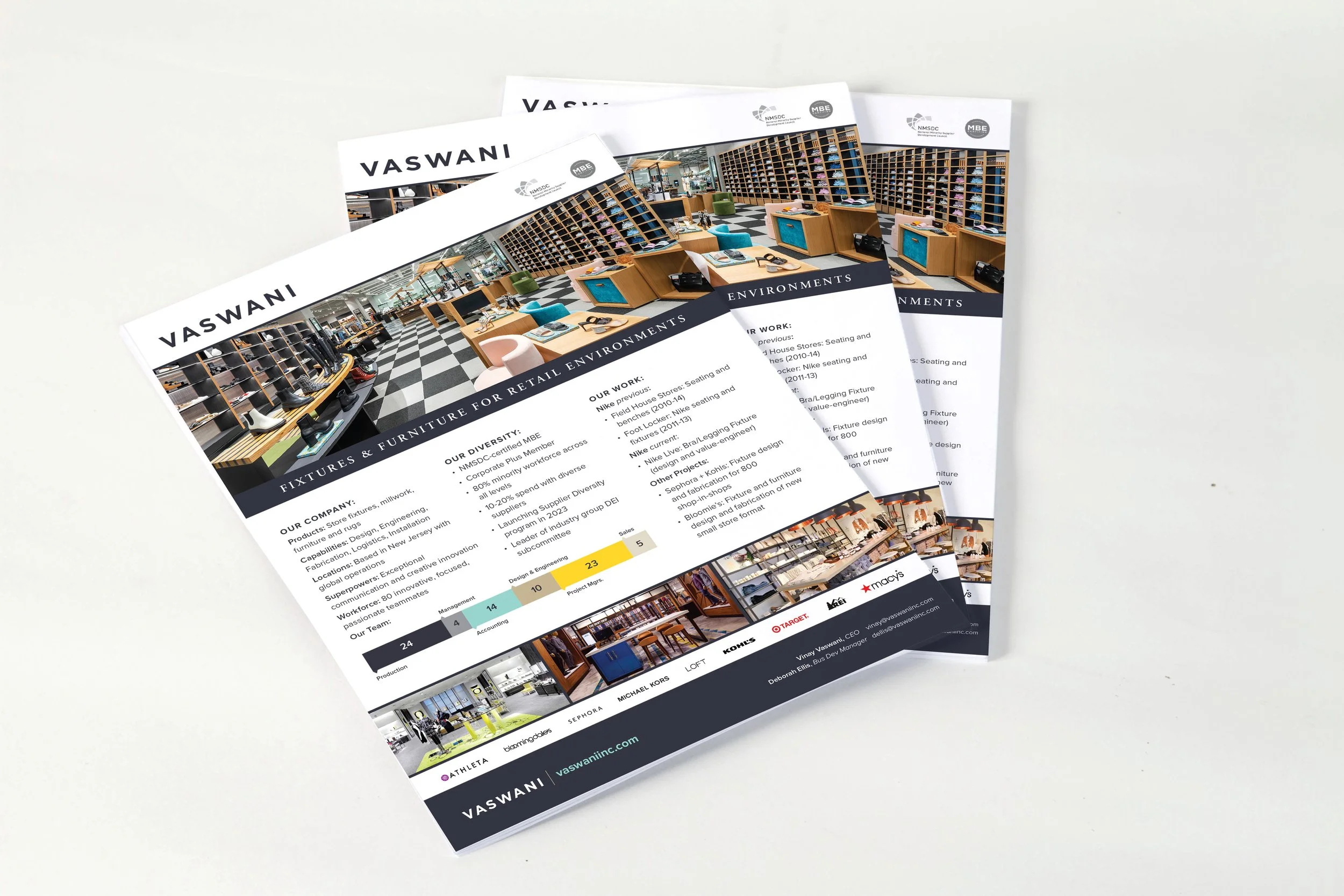 Designed a one-pager for Vaswani, a New Jersey–based company, as part of a Nike campaign highlighting potential business partners. The objective was to present complex content in a clear, visually engaging layout that aligned with both Vaswani’s brand and Nike’s campaign standards. The final design balanced hierarchy, clarity, and brand consistency to communicate effectively with a corporate audience.
